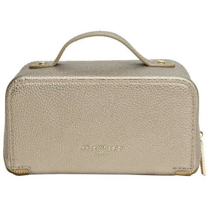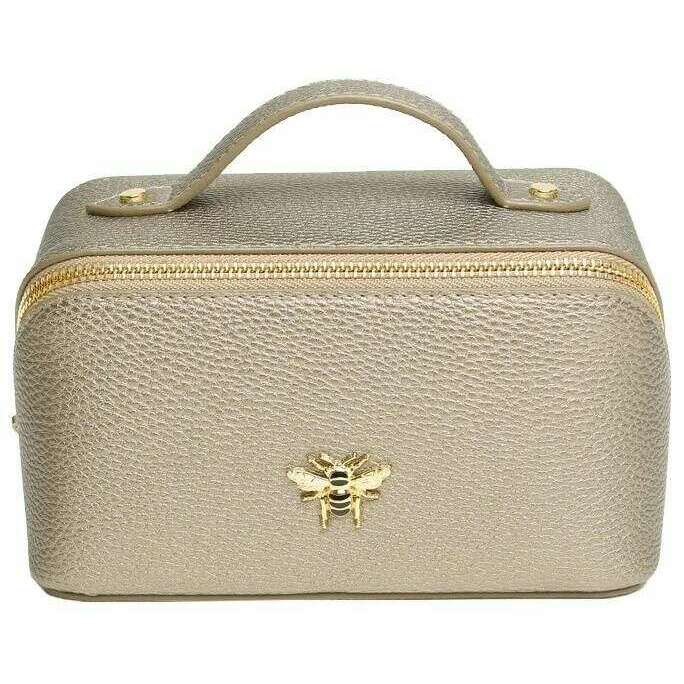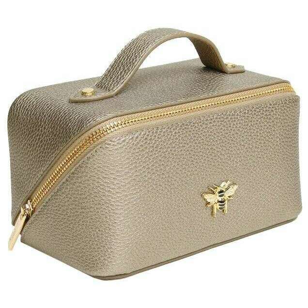 Projektantka Alice Wheeler London przyniosła ci 100% wegańską faux skórzaną torbę za pomocą brązowych odcieni. Mierzy 9,5 cm (wysokość) x 18 cm (szerokość) x 9,5 cm (głębokość). Wszystkie torby są kompletne w opakowaniu Alice Wheeler London. Mini luksusowa obudowa Alice Wheeler London - Bronze to mini wersja popularnej obudowy pociągu i jest stylowo uroczym sposobem noszenia niezbędnych przyborów toaletowych, makijażu lub innych niezbędnych informacji o podróży. Wewnątrz jest w pełni wyłożone i zawiera wewnętrzne kieszenie dla mniejszych bitów oraz jako podwójna sekcja główna, dzięki czemu łatwo jest uporządkować swoje rzeczy. Wszystko jest uszczelnieniem w środku bezpiecznie z zamkiem zamkającym i jest wykończone z ikonowo pięknym ozdobem pszczół.
