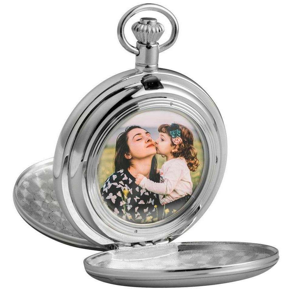 Mechaniczny zegarek kieszonkowy Burleigh z medalionem – chromowo-srebrny