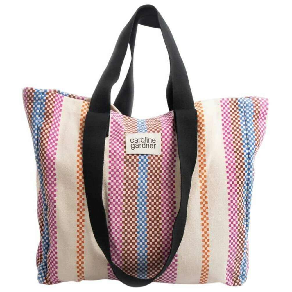 Duża płócienna torba z nadrukiem Caroline Gardner w paski - biała/różowa/pomarańczowa
