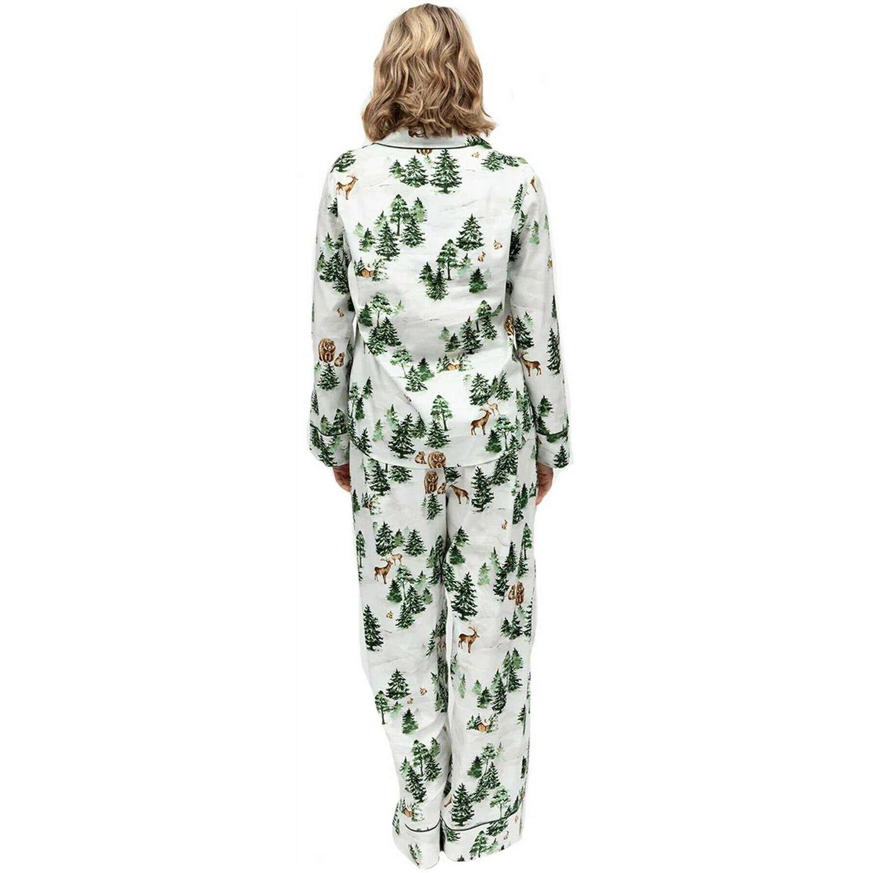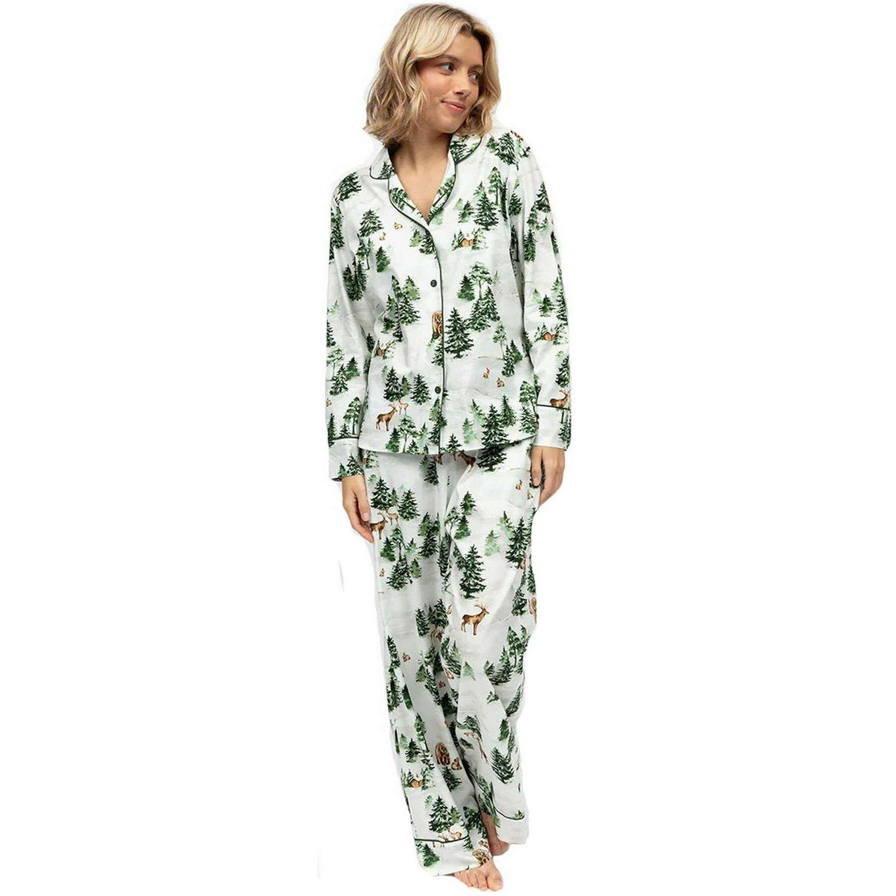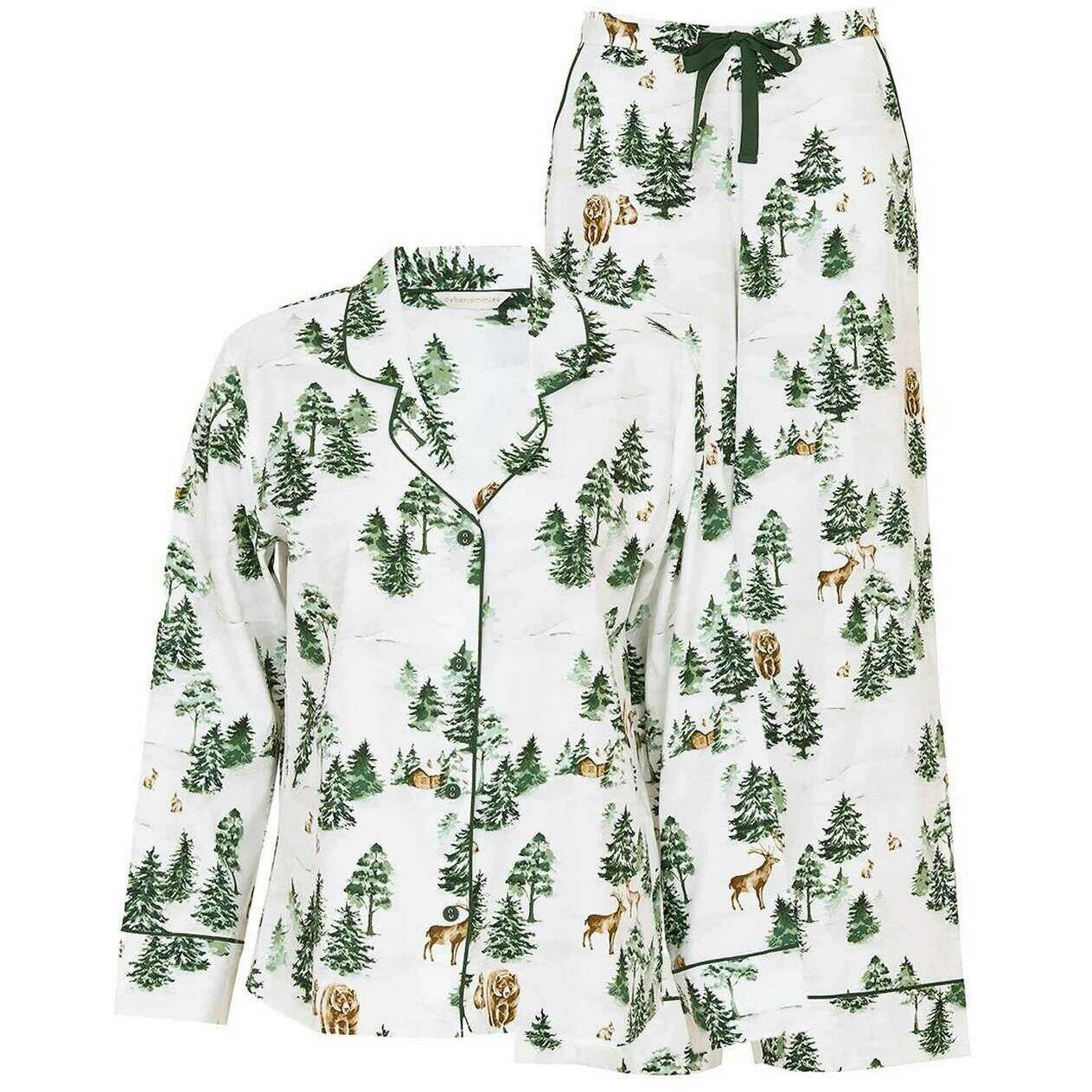 Damski komplet piżamy z dżerseju w paprocie alpejskie marki Cyberjammies jest wykonany w 60% z bawełny i w 40% z modalu i jest dostępny w kolorze zielonym. Również oliwkowo-zielona/biała piżama ma kwiatowy wzór. Zaleca się pranie w pralce na lewej stronie, nie namaczanie, pranie w podobnych kolorach, aby utrzymać piżamę w dobrym stanie. Wszystkie piżamy są wyposażone w metki cyberjammies. Zestaw piżamy Cyberjammies Fern Alpine Print Jersey — oliwkowo-zielony/biały, który wprowadzi przytulną zimową atmosferę do Twoich przestojów. Wykonany z miękkiej mieszanki bawełny i modalu, ten zestaw ma spokojny alpejski nadruk przedstawiający sosny, chaty i leśne zwierzęta na wyrazistym białym tle. Góra ma kołnierzyk, oliwkowozieloną lamówkę i zakryte guziki zapewniające dopasowane wykończenie, natomiast szerokie nogawki mają elastyczny tył, płaski przód, regulowany sznurek i boczne kieszenie zapewniające wygodę i łatwość. Idealny na świąteczne poranki lub relaksujące wieczory, ten zestaw łączy w sobie sezonowy urok z codziennym luksusem.