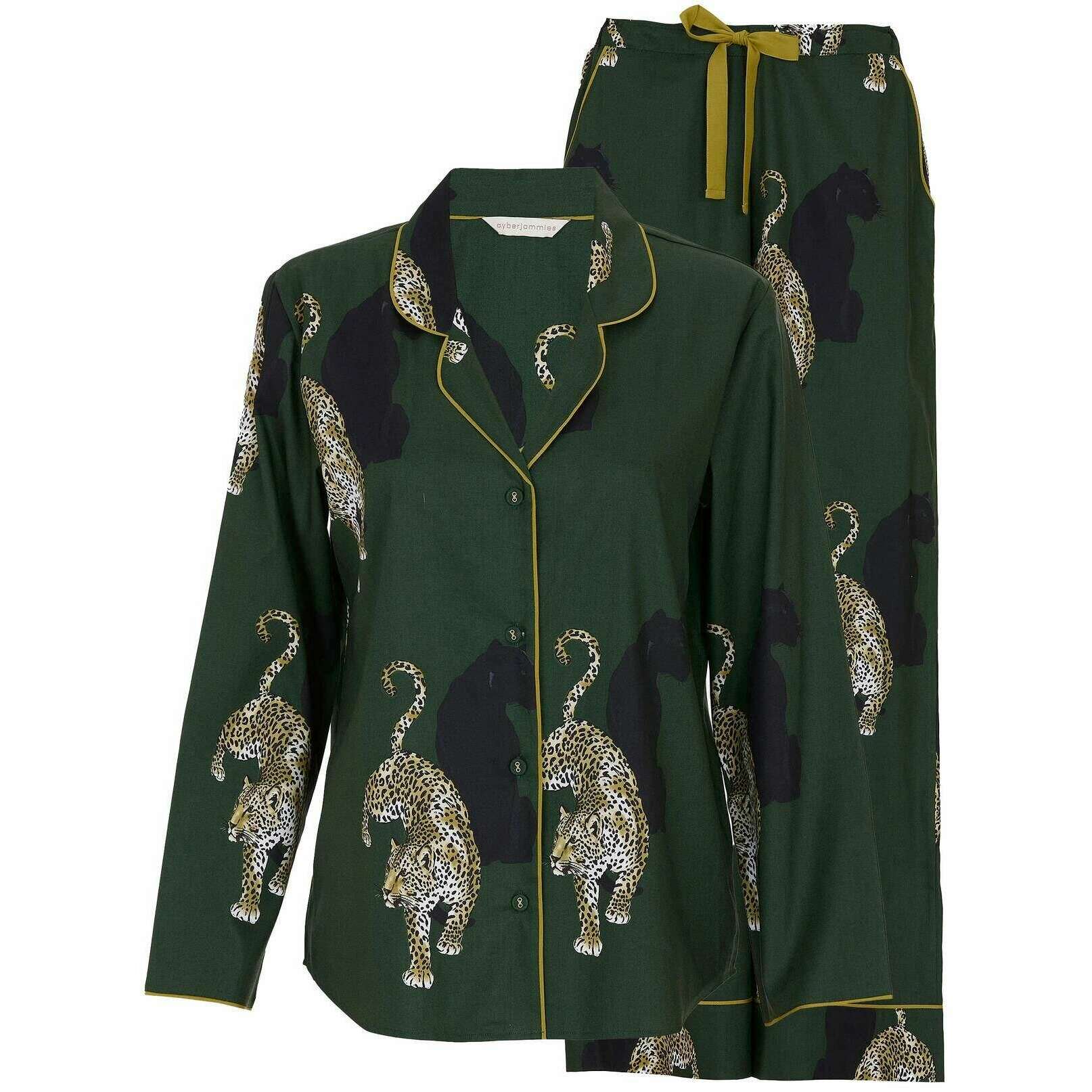 Cyberjammies Oliwkowy zestaw piżamy z długimi rękawami i szerokimi nogawkami w panterkę - zielony/złoty