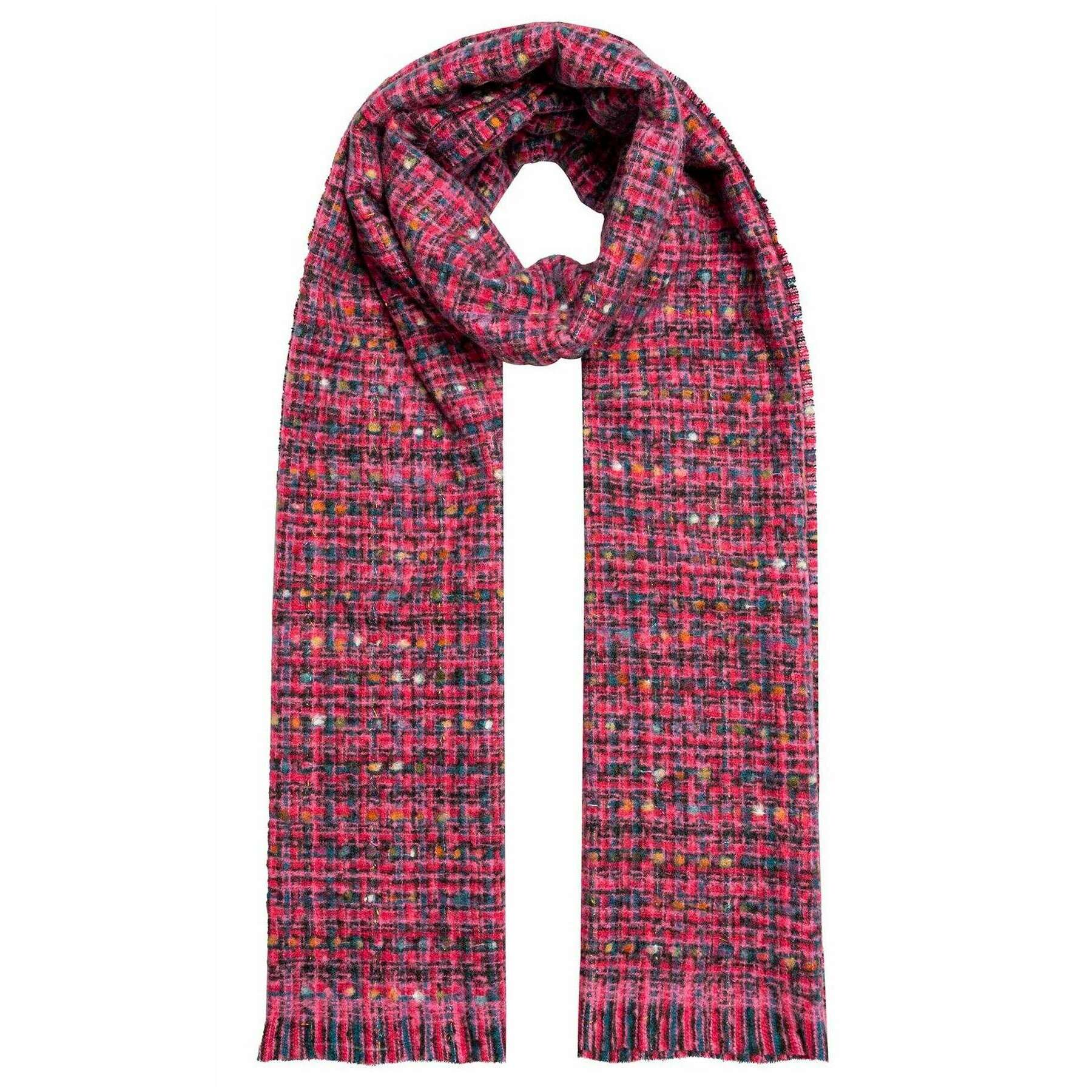 Ten damski szalik z tkanej przędzy metalicznej został wykonany w 100% z poliestru, w różowym kolorze i pochodzi od marki Dents. Wymiary: 180 cm (wysokość) x 63 cm (szerokość). Również szalik w kolorze fuksji ma wzór w kratkę. Aby zachować szalik w dobrym stanie, zaleca się pranie ręczne. Wszystkie szaliki są wyposażone w metki z wgnieceniami. Szalik Dents Woven Metallic Yarn – Fuchsia Pink ma zabawny różowy wzór w kratkę. Ten szalik jest uroczy i swobodny, idealny do ciepłego i wygodnego noszenia na co dzień. Zawiera również klasyczne frędzle, które dodają niepowtarzalnego charakteru.