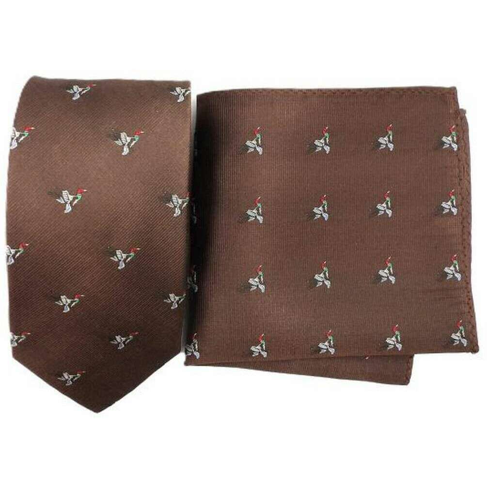 Zestaw krawatów i poszetek z kaczego jedwabiu na szyję Knightsbridge - brązowy