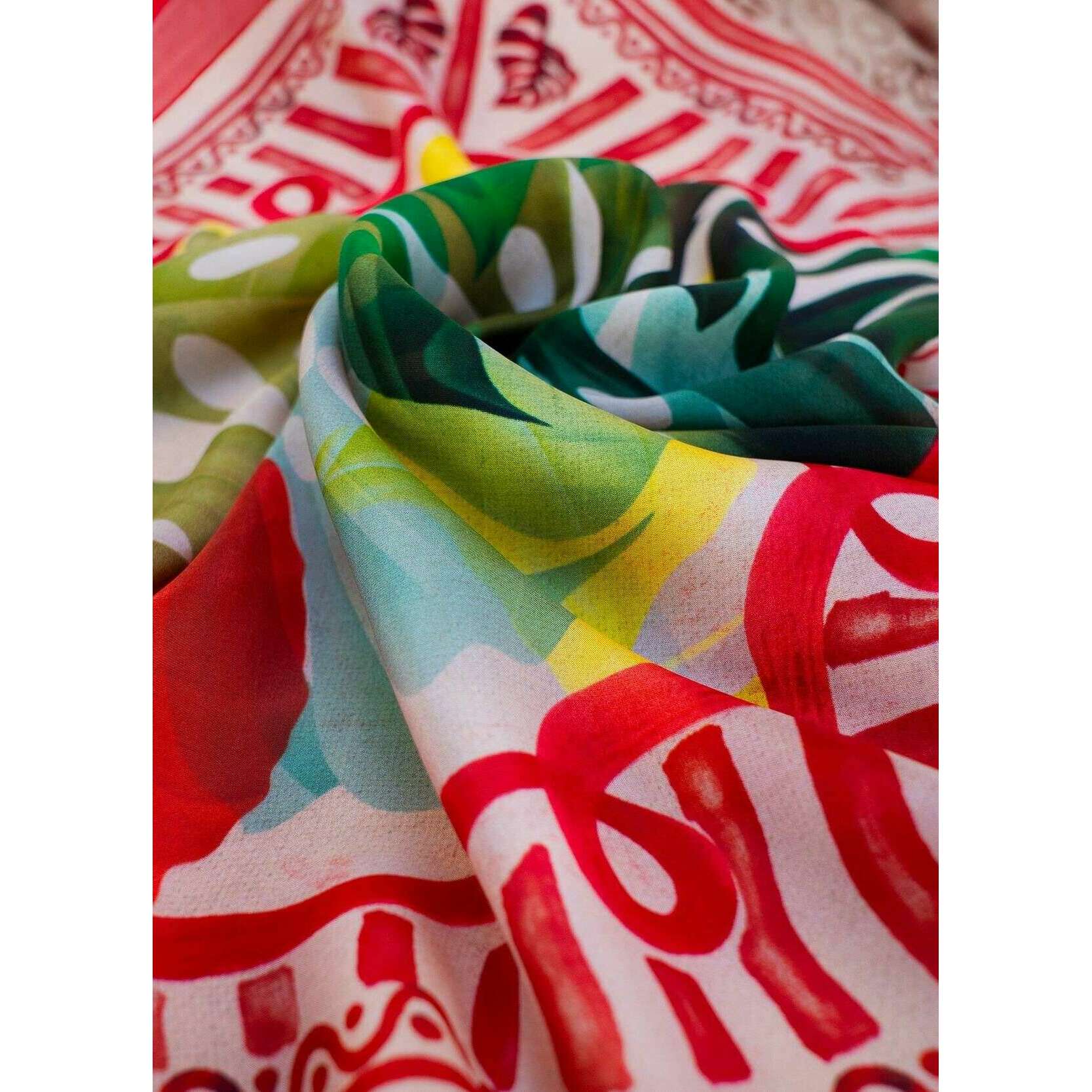Kwadratowy szalik jedwabny w proszku w liście egzotyczne - czerwony/beżowy/zielony