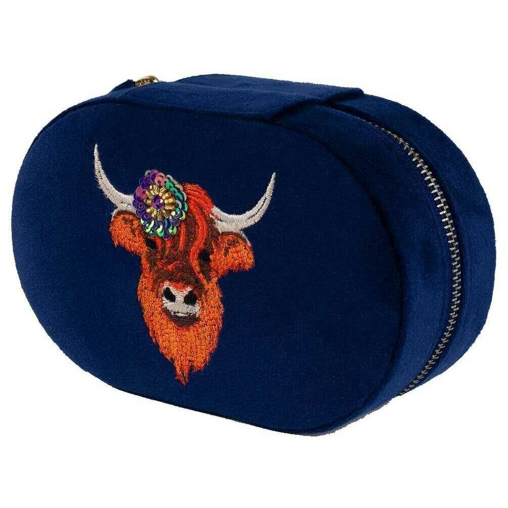 Owalne pudełko na biżuterię Powder Highland Cow - granatowy/pomarańczowy/beżowy