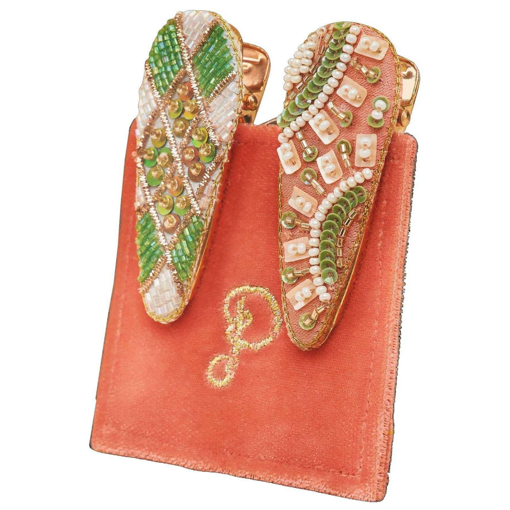 Te różowe/zielone/kremowe damskie spinki do włosów wykonane w 100% z aksamitu poliestrowego autorstwa projektanta Powder. Wymiary: 8 cm (wysokość) x 7 cm (szerokość). Zestaw 2 akcesoriów do włosów jest wart swojej ceny i gwarantuje, że to dobry zakup. Wszystkie akcesoria do włosów są dostarczane w komplecie z pudrem. Spinki do włosów w kolorze pudrowym Sunny – różowy/zielony/kremowy urozmaicą fryzurę przy każdej okazji, dodając stylowego charakteru, który sprawi, że ludzie będą się gapić. Pięknie ozdobiony misternymi koralikami i haftem, ten zestaw 2 spinek do włosów jest koniecznością w Twojej kolekcji.