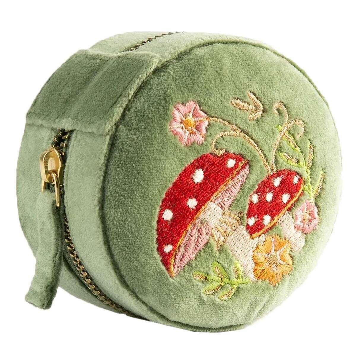 Okrągłe aksamitne pudełko biżuterii w proszku marki są wykonane z 100% aksamitu poliestrowego i jest prezentowane na zielono. Mierzy 4,5 cm (wysokość) x 8 cm (szerokość). Wszystkie pudełka biżuterii są kompletne z tagami proszkowymi. Okrągłe aksamitne pudełko biżuterii w proszku - Sage Green to oszałamiająca obudowa, która utrzyma biżuterię w najsłodszym i najbardziej eleganckim sposób. Wyposażony w sekcję uchwytu pierścieniowego, dwa oddzielne mini tac i elastyczną kieszeń opaski dla bezpiecznego wstrzymania. Idealny do podróży, na nocleg, na siłownię lub po prostu bezpiecznie przechowywać swoje ulubione elementy. Ten piękny okrągły design tworzy świetny rozmiar, aby zmieścić się w dowolnej torbie z wyboru w podróży. Haftowany na zewnątrz dodaje uroczego i eleganckiego wyglądu, podczas gdy złoty zamek błyskawiczny dodaje końcowy akcent.