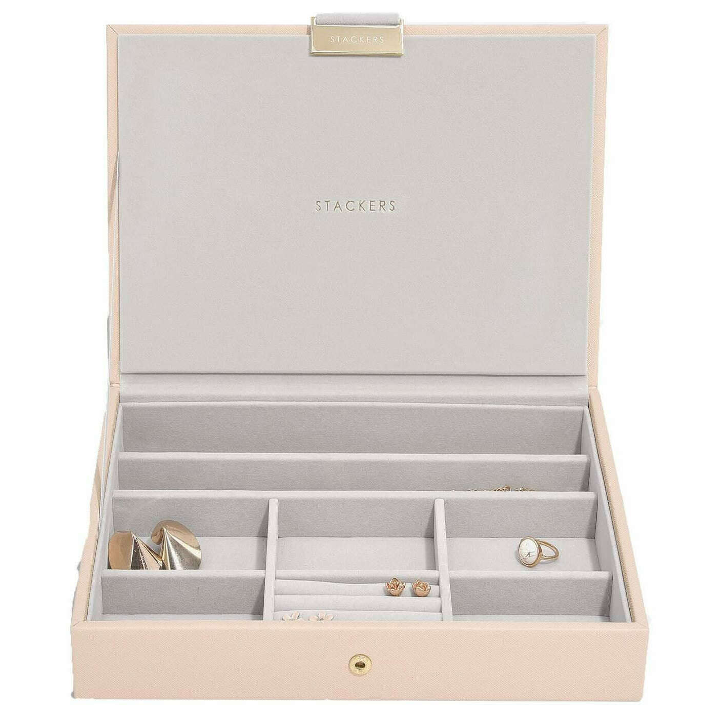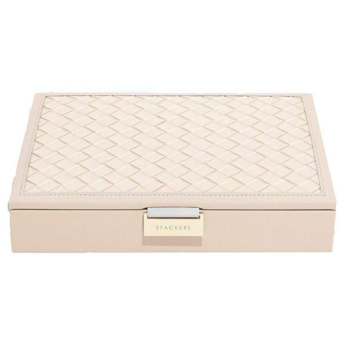 Ta dobrze wykonana, klasyczna damska pokrywa pudełka na biżuterię firmy Stackers jest dostępna w kolorze różowej tkaniny i jest wykonana ze sztucznej skóry i aksamitu. Wymiary: 4,7 cm (wysokość) x 25 cm (szerokość) x 18 cm (głębokość). Wszystkie pudełka na biżuterię są dostarczane w komplecie z opakowaniami typu stacker. Klasyczne wieczko do pudełka na biżuterię Stackers – Blush Pink Woven ma piękny, tkany różowy wzór. Ta pokrywa pudełka na biżuterię jest idealna do przechowywania wszystkich przedmiotów jubilerskich! W komplecie z różnymi rozmiarami sekcji na pierścionki, kolczyki, bransoletki i naszyjniki.