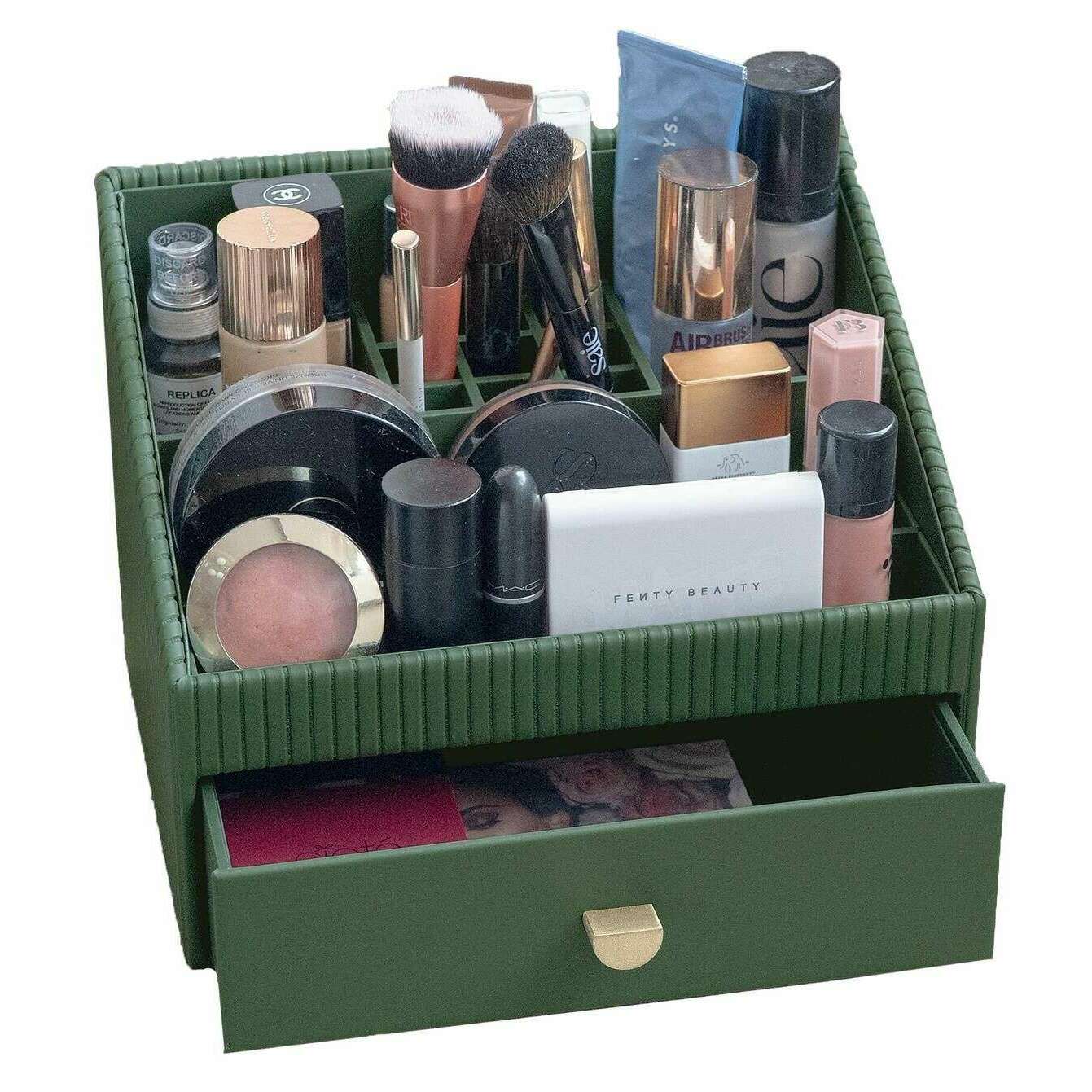 Ten klasyczny organizer do makijażu dla kobiet marki Stackers jest wykonany ze sztucznej skóry i PCV i ma kolor zielony. Wymiary: 19 cm (wysokość) x 25 cm (szerokość) x 18 cm (głębokość). Wszystkie organizery do makijażu są dostarczane w komplecie z opakowaniami typu stacker. Klasyczny organizer do makijażu Stackers – szmaragdowo-zielony ma wiele przegródek na produkty do makijażu i pielęgnacji skóry. Ten piękny, żebrowany zielony organizer do makijażu ma miejsce na większe produkty, idealny do utrzymywania porządku i oszczędzania miejsca!