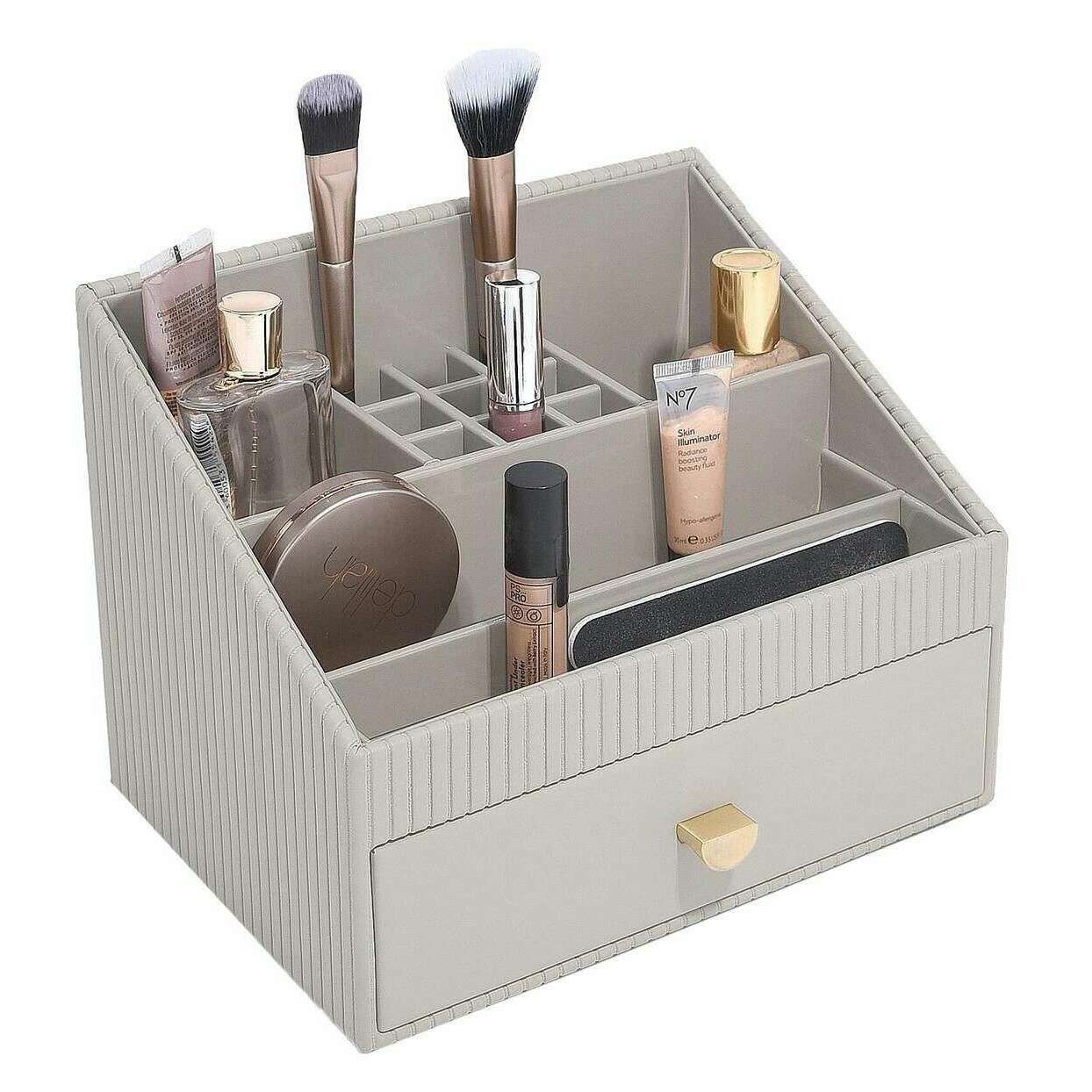 Ten klasyczny organizer do makijażu dla kobiet, dostarczony przez markę Stackers, w kolorze wapiennoszarym, wykonany jest ze sztucznej skóry i PCV. Wymiary: 19 cm (wysokość) x 25 cm (szerokość) x 18 cm (głębokość). Wszystkie organizery do makijażu są dostarczane w komplecie z opakowaniami typu stacker. Klasyczny organizer do makijażu Stackers - Limestone Grey ma wiele przegródek na produkty do makijażu i pielęgnacji skóry. Ten piękny, prążkowany, szary organizer do makijażu ma miejsce na większe produkty, idealne do utrzymywania porządku i oszczędzania miejsca!