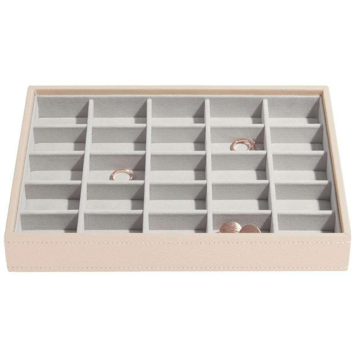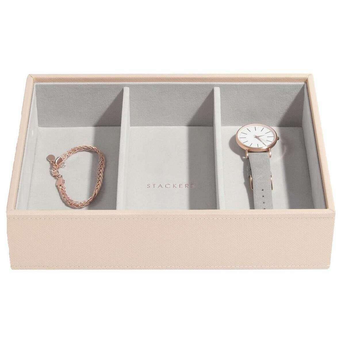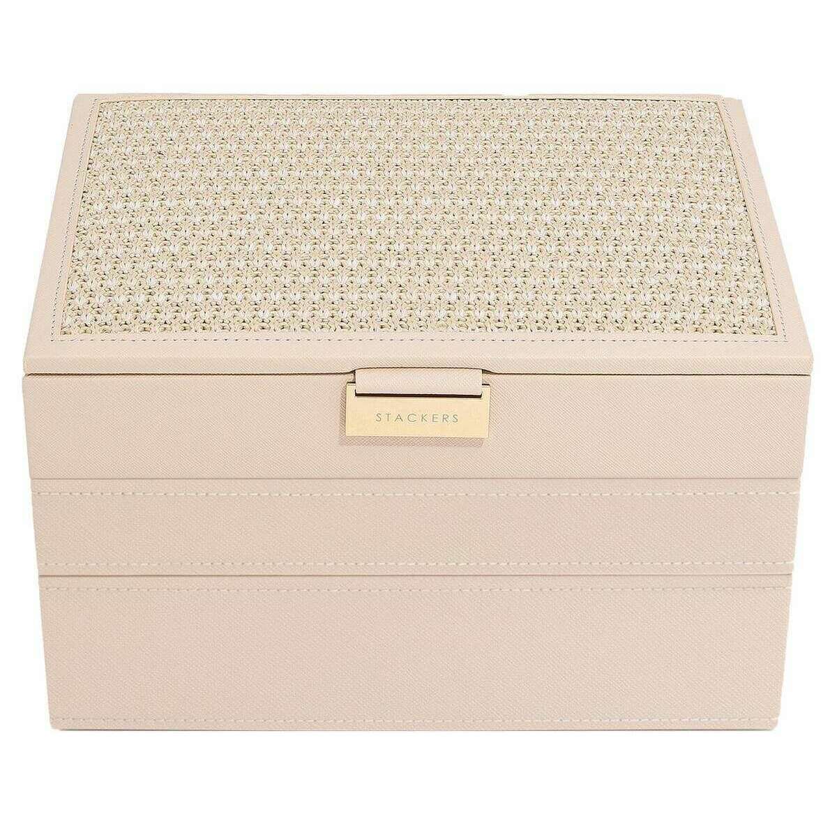 Ten klasyczny damski zestaw 3 pudełek na biżuterię w kolorze różowej rafii, dostarczony przez markę Stackers, jest wykonany ze sztucznej skóry i aksamitu. Wymiary: 13,7 cm (wysokość) x 25 cm (szerokość) x 18 cm (głębokość). Wszystkie pudełka na biżuterię są dostarczane w komplecie z opakowaniami typu stacker. Klasyczny zestaw 3 pudełek na biżuterię Stackers - Blush Pink Rafia ma unikalny wzór różowego pudełka na biżuterię z rafii. To pudełko na biżuterię jest idealne do przechowywania całej Twojej biżuterii! W komplecie trzy warstwy i różnej wielkości sekcje na kolczyki, pierścionki i bransoletki oraz większa sekcja na zegarki i bransoletki.