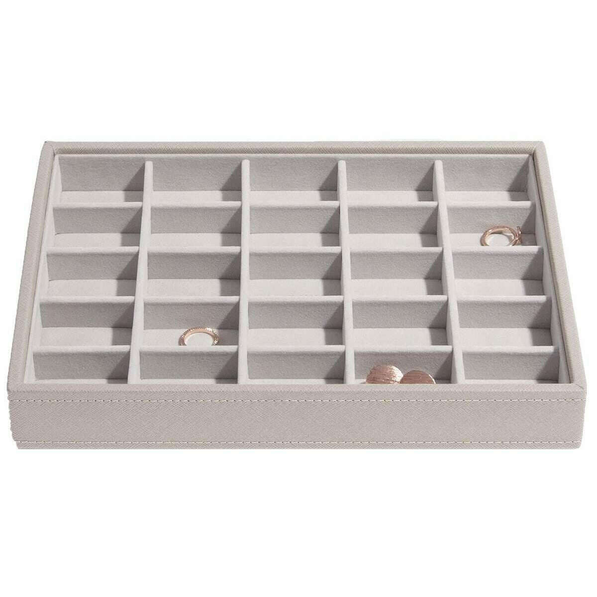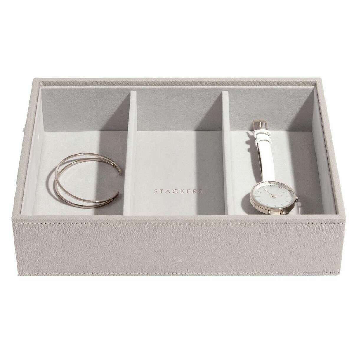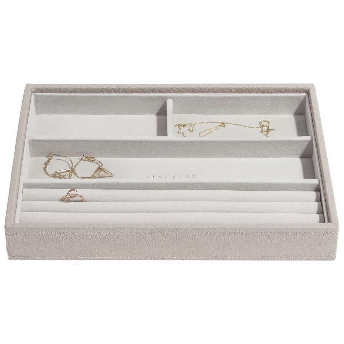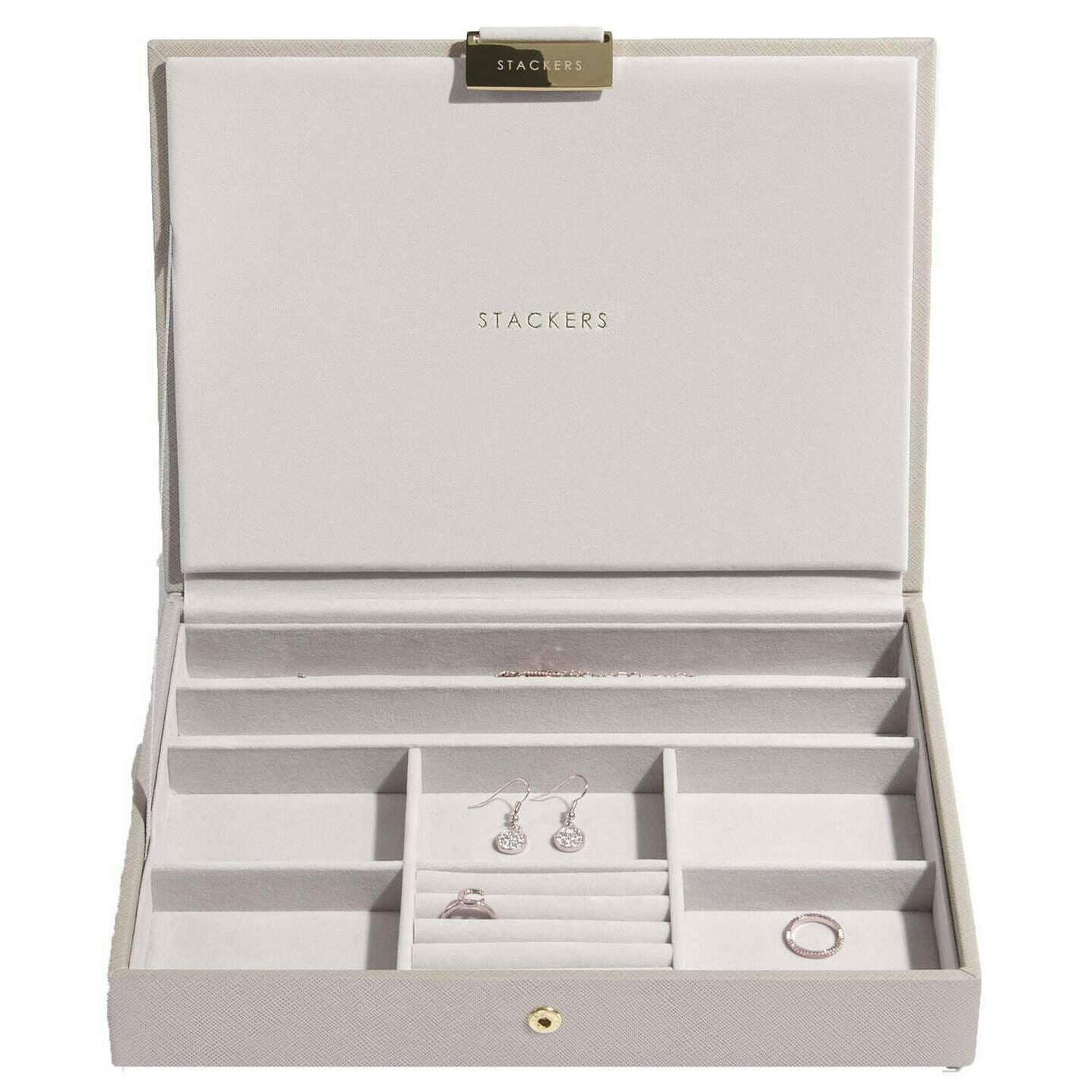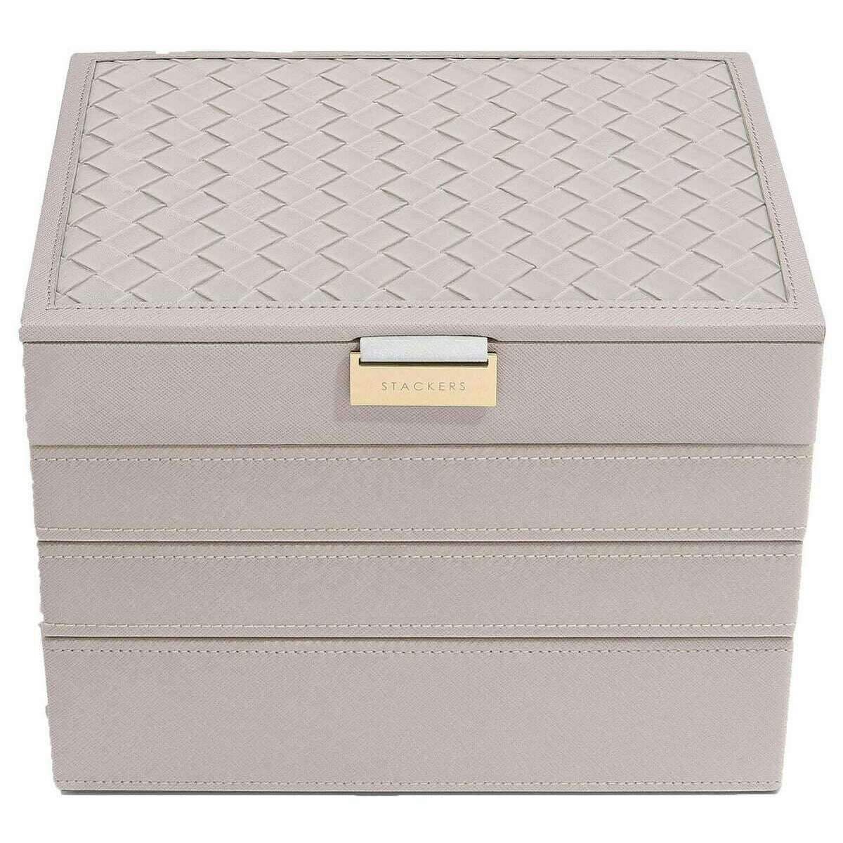 Wykonany ze sztucznej skóry i aksamitu, ten klasyczny damski zestaw 4 pudełek na biżuterię w kolorze taupe autorstwa projektanta Stackers. Wymiary: 19,5 cm (wysokość) x 25 cm (szerokość) x 18 cm (głębokość). Wszystkie pudełka na biżuterię są dostarczane w komplecie z opakowaniami typu stacker. Klasyczny zestaw 4 pudełek na biżuterię Stackers - Taupe ma klasyczny wygląd pudełka na biżuterię w kolorze ciemnoszarym. To pudełko na biżuterię jest idealne do przechowywania całej Twojej biżuterii! W zestawie cztery warstwy i sekcje o różnych rozmiarach na kolczyki, pierścionki i bransoletki oraz większa sekcja na zegarki i bransoletki.