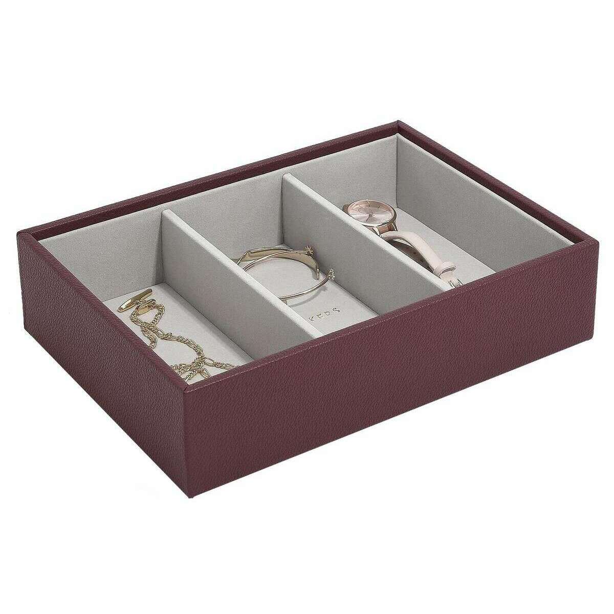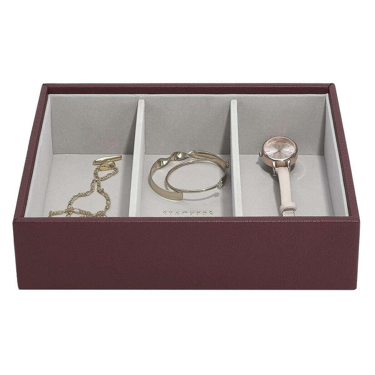 Ta klasyczna warstwa akcesoriów do zegarków firmy Stackers, wykonana z bordowej sztucznej skóry i aksamitu, jest idealna dla kobiet i obowiązkowa. Wymiary: 6 cm (wysokość) x 25 cm (szerokość) x 18 cm (głębokość). Wszystkie pudełka na biżuterię są dostarczane w komplecie z opakowaniami typu stacker. Warstwa akcesoriów do klasycznych zegarków Stackers — burgundowa zawiera trzy większe sekcje, w których można umieścić dowolną większą biżuterię. Ta piękna, bordowa warstwa biżuterii jest idealna do przechowywania większych przedmiotów, takich jak okulary przeciwsłoneczne, zegarki i bransoletki.