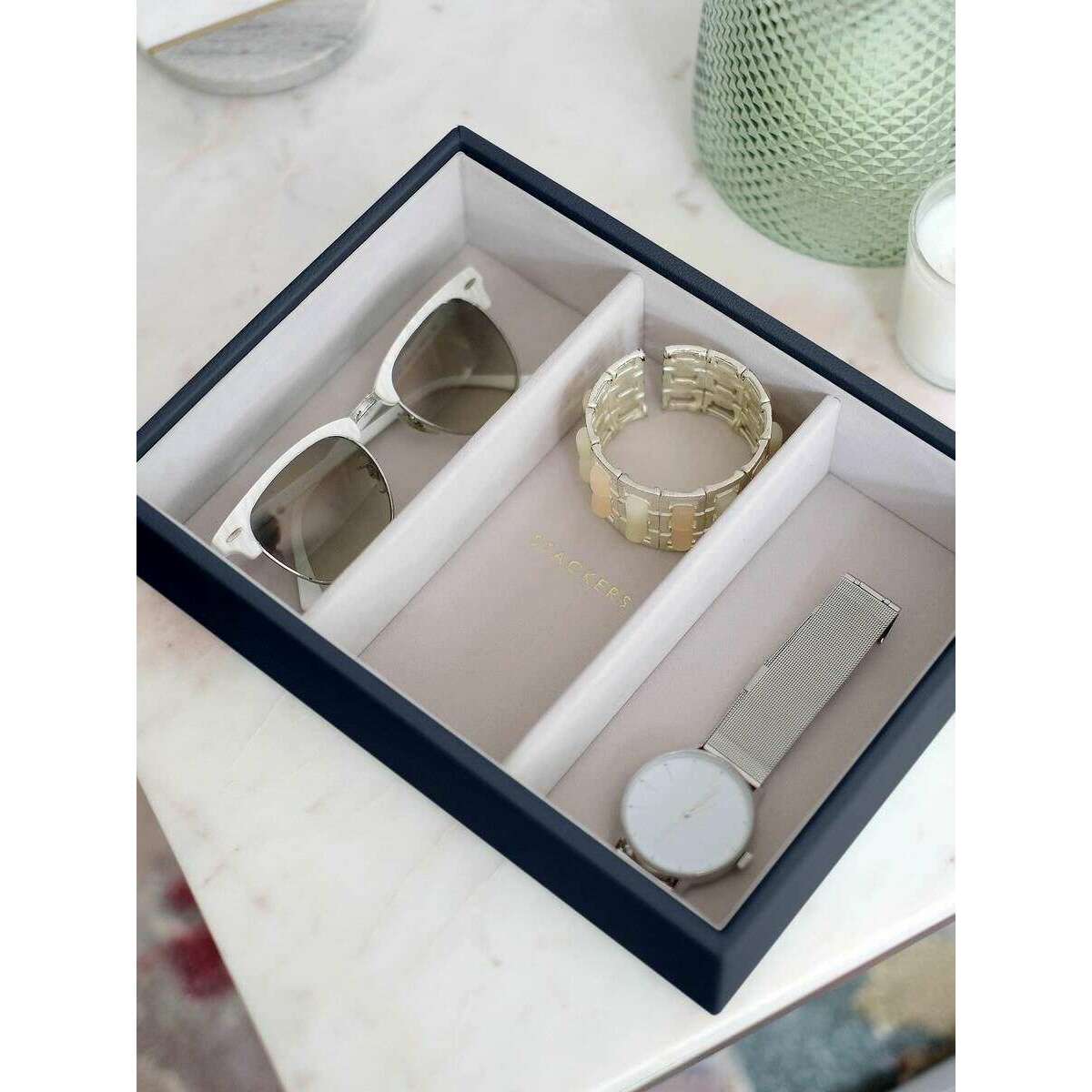 Granatowa, klasyczna damska warstwa akcesoriów do zegarków, wykonana ze sztucznej skóry i aksamitu, autorstwa projektanta Stackersa. Wymiary: 6 cm (wysokość) x 25 cm (szerokość) x 18 cm (głębokość). Aby zachować pudełko na biżuterię w dobrym stanie, zaleca się wycieranie go do czysta. Wszystkie pudełka na biżuterię są dostarczane w komplecie z opakowaniami typu stacker. Warstwa akcesoriów Stackers Classic Watch – granatowa jest idealna do przechowywania okularów i większych akcesoriów i może być używana jako miejsce do przechowywania w szufladzie lub ułożona z innymi warstwami z kolekcji Stackers, tworząc niestandardowe pudełko na biżuterię. Idealna dla kobiet, które uwielbiają dodatki. Ta urocza warstwa wygląda elegancko i elegancko i została profesjonalnie wykonana z wysokiej jakości materiałów.