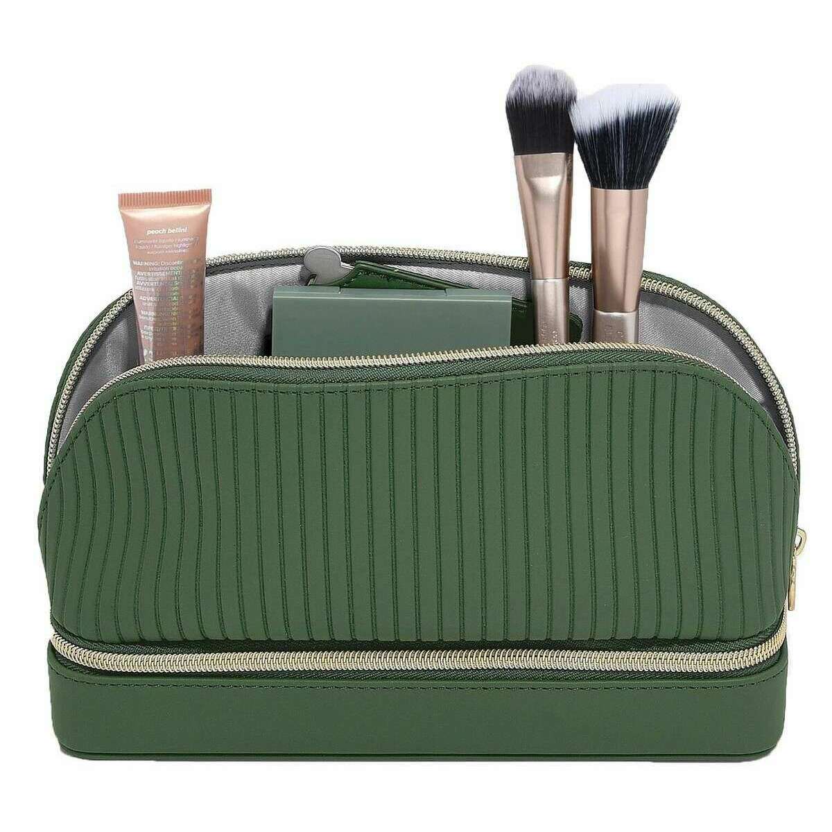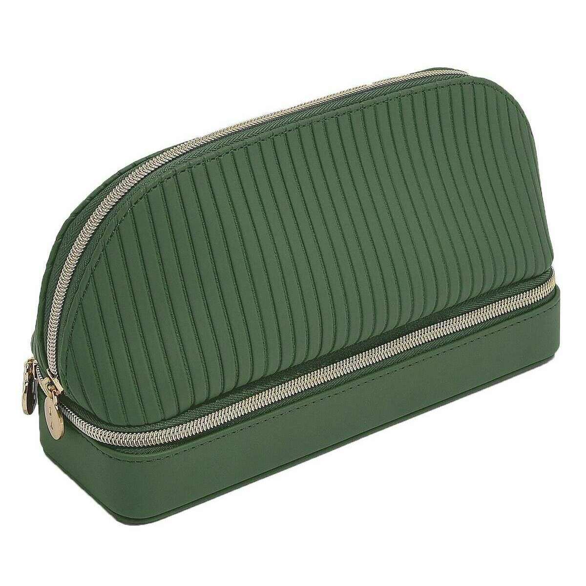 Przedstawiamy tę damską torbę na kosmetyki i biżuterię firmy Stackers, wykonaną ze sztucznej skóry i aksamitu w szmaragdowozielonym kolorze. Wymiary: 15 cm (wysokość) x 24 cm (szerokość) x 8,5 cm (głębokość). Wszystkie torby są dostarczane w komplecie z opakowaniem typu stacker. Torba na kosmetyki i biżuterię Stackers w kolorze szmaragdowej zieleni to must have w podróży! Ta klasyczna zielona torba na kosmetyki i biżuterię ma dwie główne przegródki, jedną na kosmetyki i pielęgnację skóry, a drugą z rolkami na pierścionki i wyjmowaną przegrodą na naszyjniki na biżuterię.