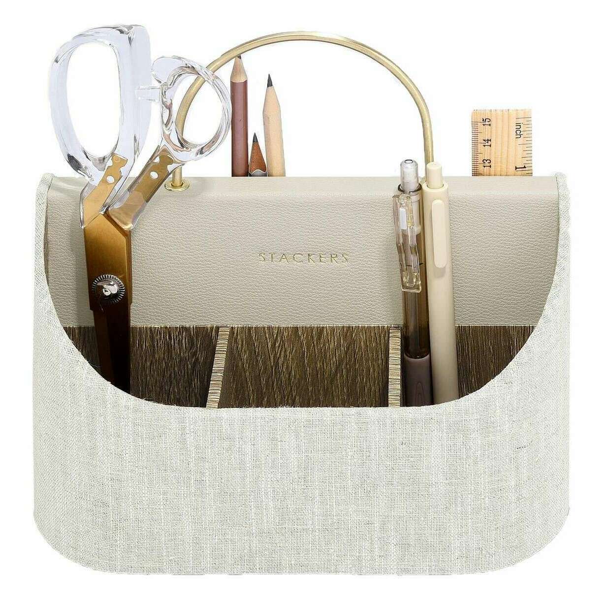 Ten koszyk na biurko dla kobiet został zaprojektowany przez markę Stackers w beżowym kolorze i jest wykonany ze sztucznej skóry. Wymiary: 21 cm (wysokość) x 21 cm (szerokość) x 13 cm (głębokość). Wszystkie akcesoria do biurek są dostarczane w komplecie z opakowaniami do układania. Caddy na biurko Stackers - beż owsiany/beż lniany to obowiązkowy element każdego biurka! Ten beżowy pojemnik na biurko idealnie nadaje się do przechowywania stacjonarnego, a nawet ma uchwyt, który ułatwia jego przenoszenie.