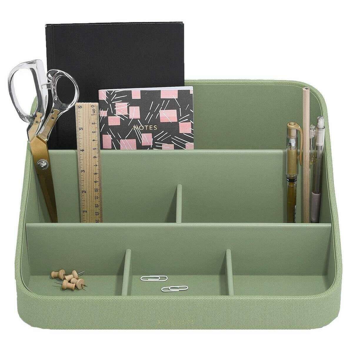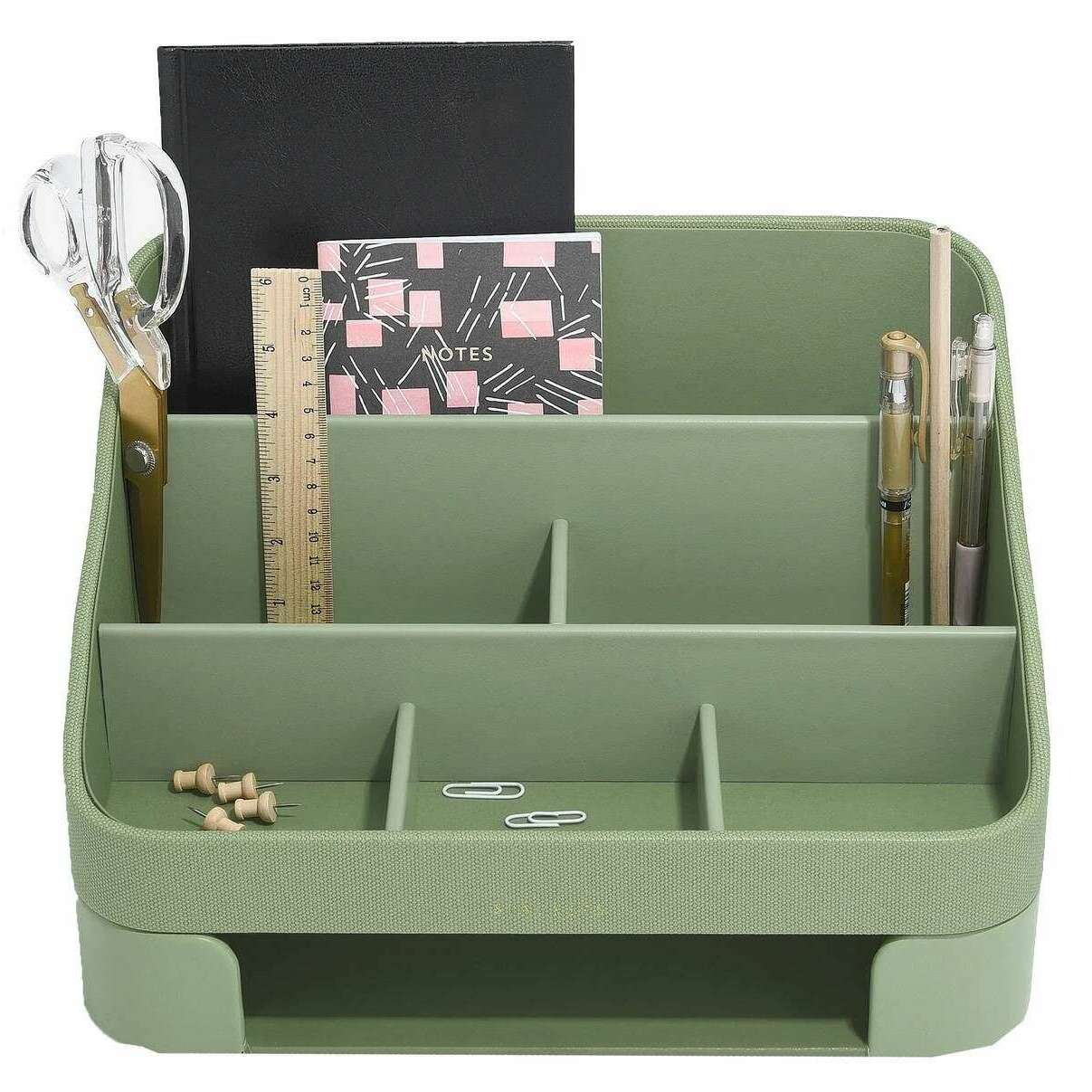 Przedstawiamy zestaw organizerów na biurko dla kobiet firmy Stackers. Wykonany jest on ze sztucznej skóry w kolorze pistacjowej zieleni. Wymiary: 20 cm (wysokość) x 25 cm (szerokość) x 33 cm (głębokość). Wszystkie akcesoria do biurek są dostarczane w komplecie z opakowaniami do układania. Zestaw organizerów na biurko Stackers - Pistachio Green ma piękny zielony wzór. Ten organizer na biurko ma wiele przegródek na artykuły papiernicze, notesy i wiele innych drobiazgów. W komplecie z półką na listy zapewniającą dodatkowe miejsce do przechowywania.