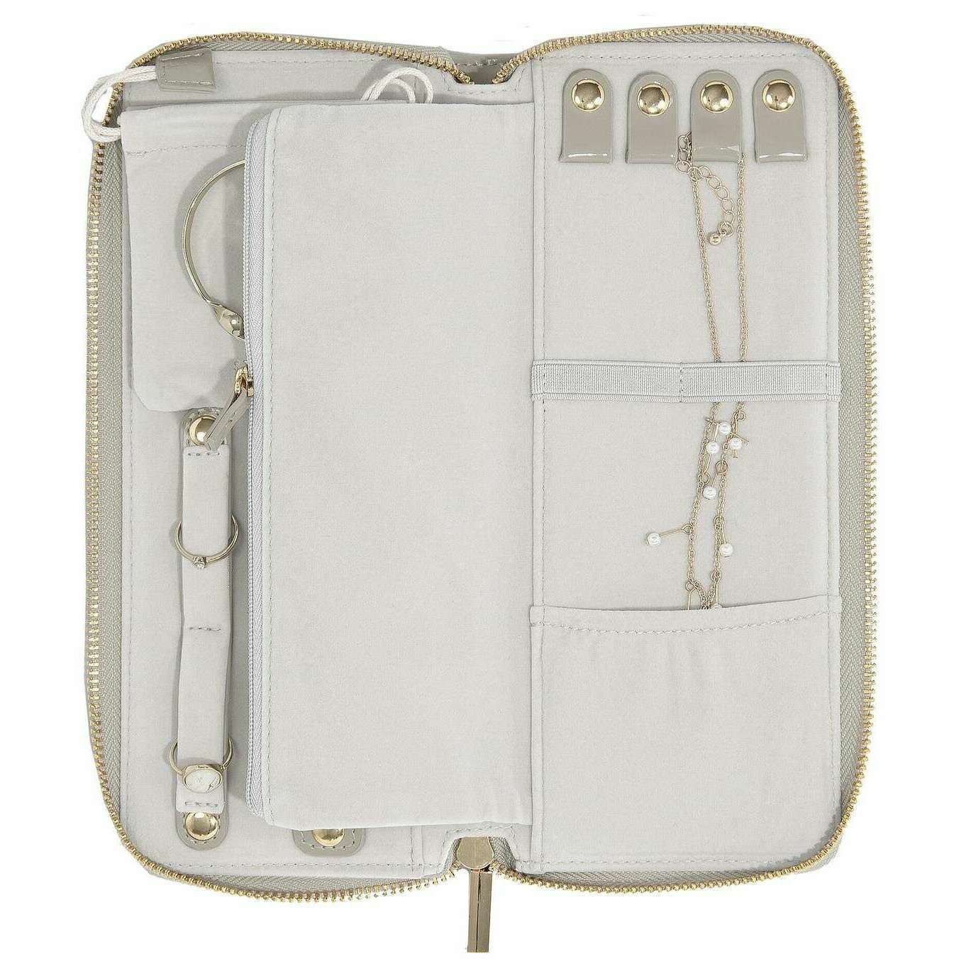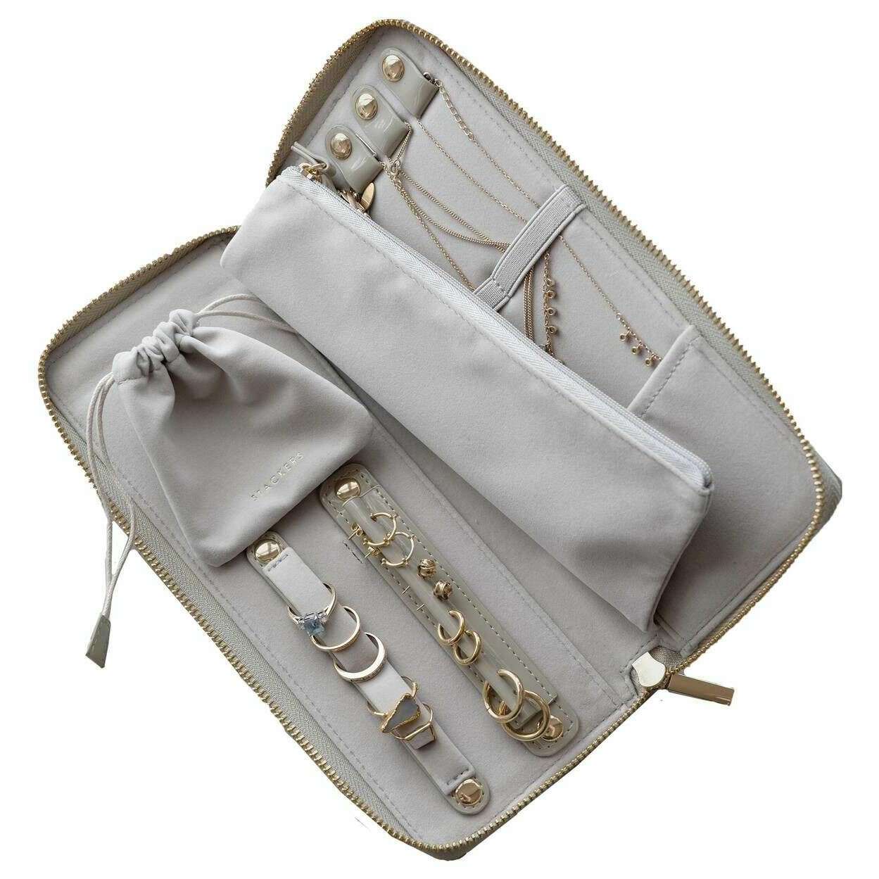 Przedstawiamy damską biżuteryjną rolkę firmy Stackers, wykonaną ze sztucznej skóry w lakierowanym szarym kolorze. Wymiary: 3 cm (wysokość) x 24,5 cm (szerokość) x 10,3 cm (głębokość). Wszystkie pudełka na biżuterię są dostarczane w komplecie z opakowaniami typu stacker. Rolka z biżuterią Stackers - Patent Putty Grey to absolutny must-have, gdy jesteś w podróży! Ta szara rolka na biżuterię jest idealna do podróżowania z biżuterią i jest zapinana na zamek błyskawiczny dla dodatkowego bezpieczeństwa.