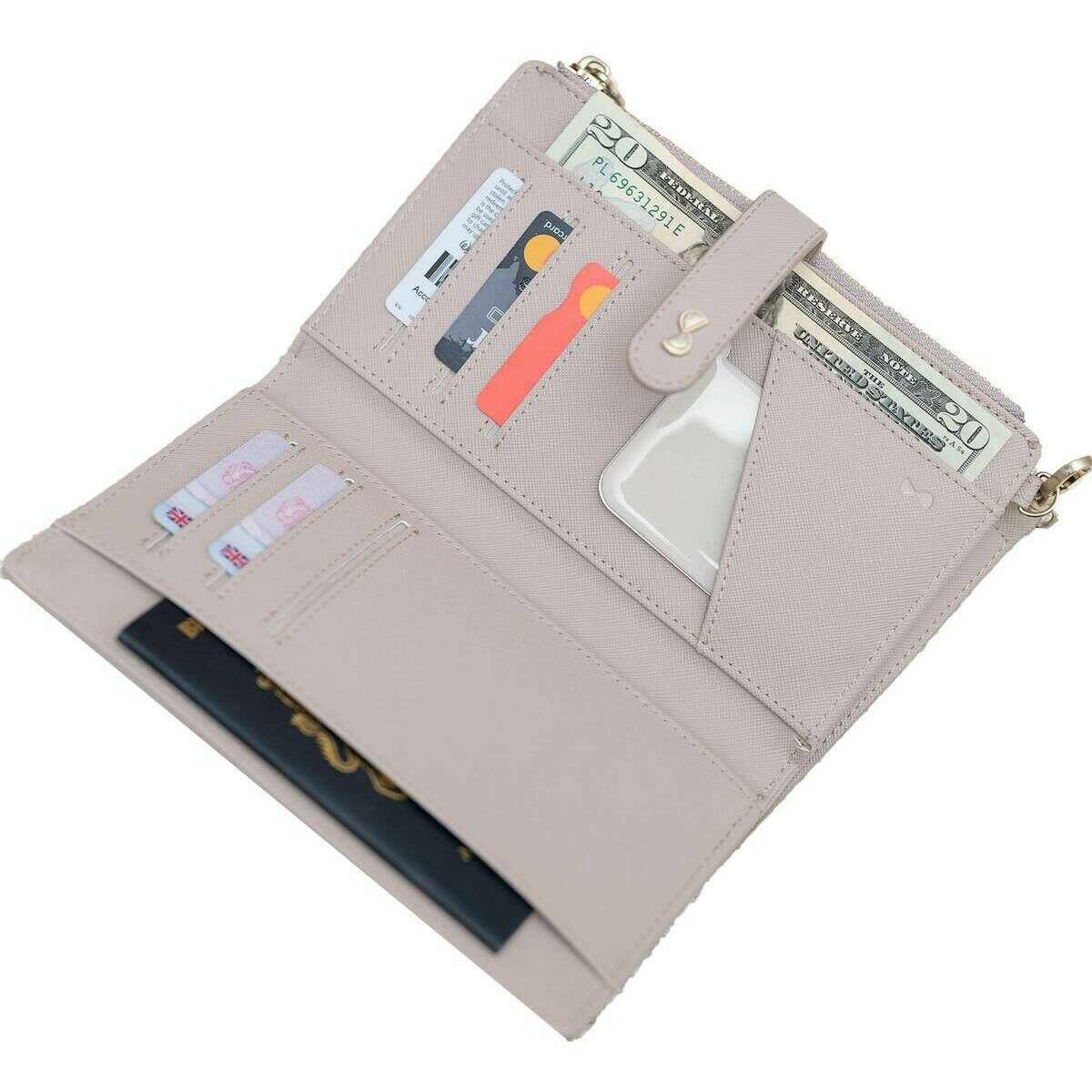 • Zewnętrzna kieszeń na telefon , 6 miejsc na karty , lusterko kosmetyczne , wyjmowana kieszonka na monety zapinana na zamek , odpinany pasek na nadgarstek , zapięcie na zatrzask