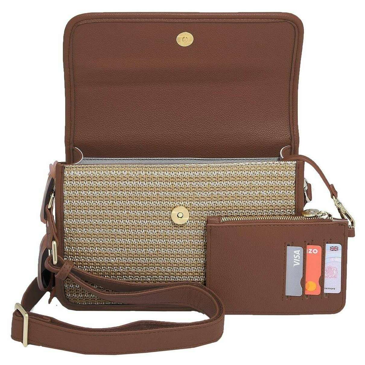 Idealna dla kobiet jest ta torba na ramię firmy Stackers w kolorze jasnobrązowym z rafii. Jest ona również wykonana z efektu rafii i sztucznej skóry. Wymiary: 17 cm (wysokość) x 7,5 cm (szerokość) x 25 cm (głębokość). Wszystkie torby są dostarczane w komplecie z opakowaniem typu stacker. Torba na ramię Stackers Raffia - brązowa rafia to must-have, gdy jesteś w podróży! Ta wyjątkowa i modna torebka na ramię z brązowej rafii ma wiele kieszeni, lusterko kosmetyczne i wyjmowaną torebkę na karty. Idealna do codziennego użytku dzięki odpinanemu i regulowanemu paskowi na krzyż.