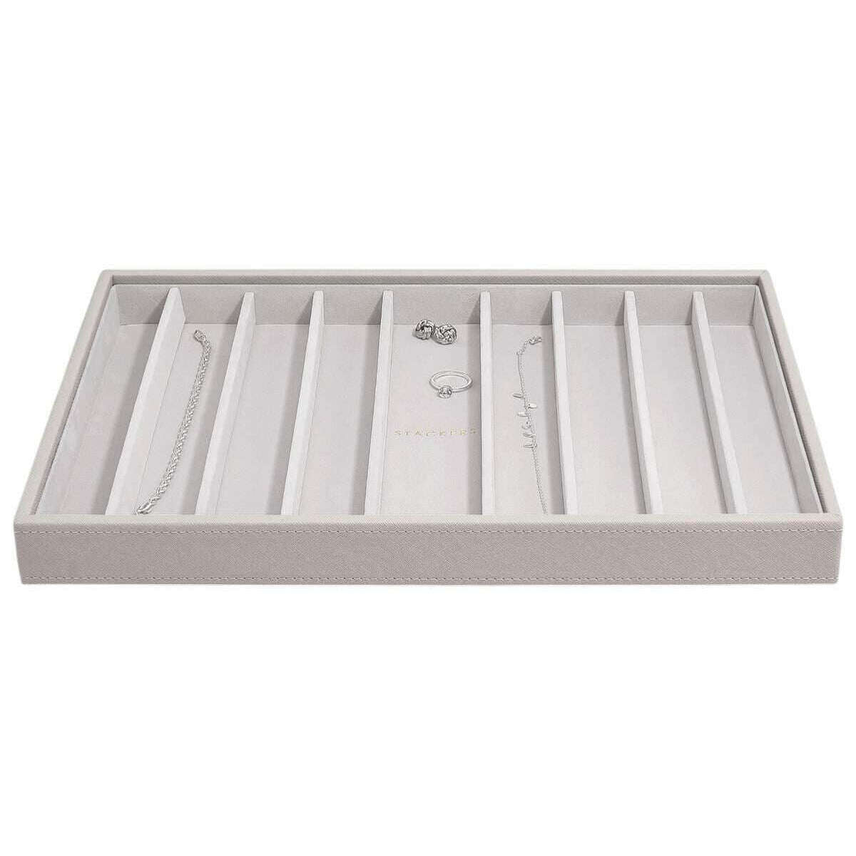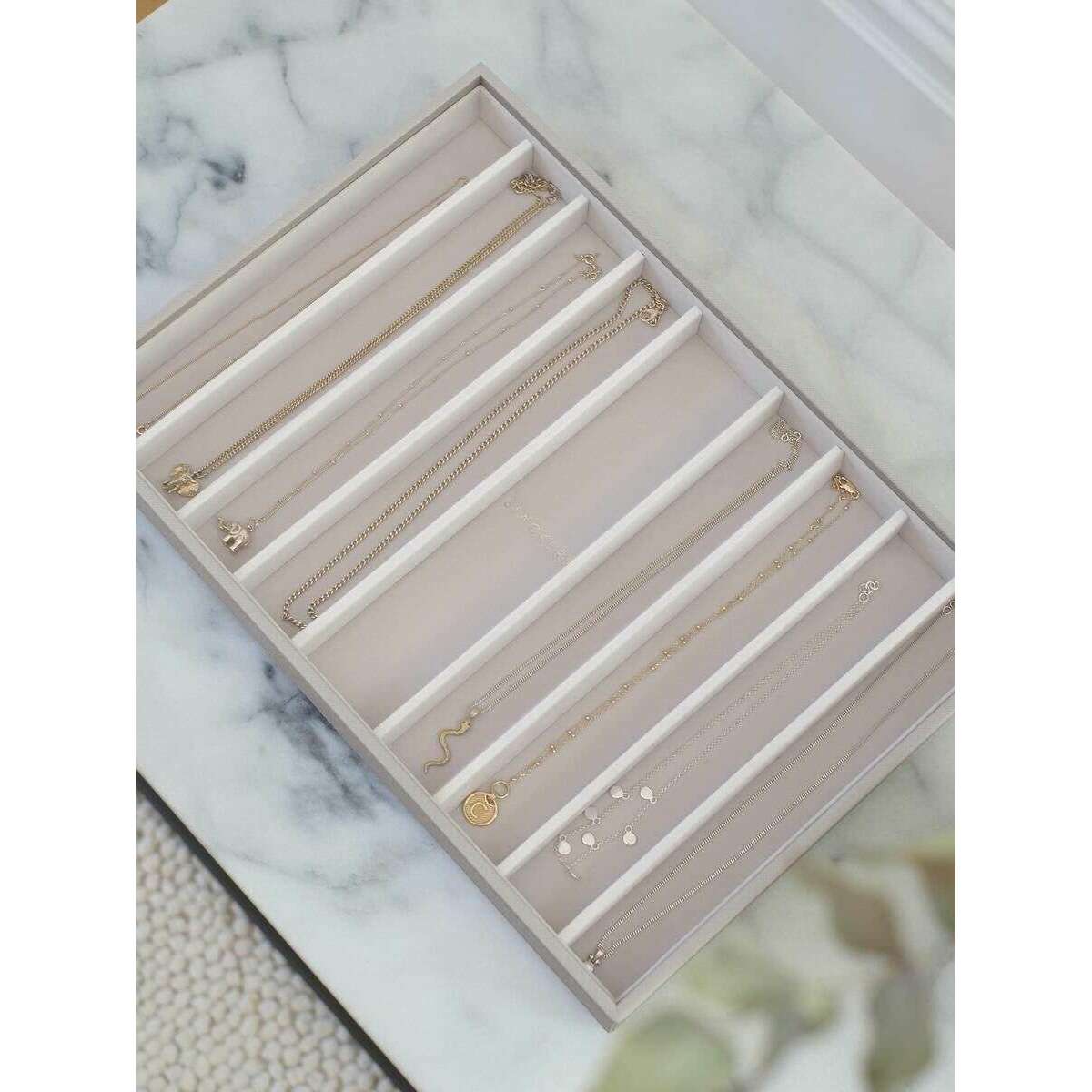 Ta dobrze wykonana damska warstwa naszyjnika typu supersize firmy Stackers jest dostępna w kolorze taupe beżowym i wykonana ze sztucznej skóry i aksamitu. Wymiary: 4 cm (wysokość) x 36 cm (szerokość) x 23,9 cm (głębokość). Aby zachować pudełko na biżuterię w dobrym stanie, zaleca się wycieranie go do czysta. Wszystkie pudełka na biżuterię są dostarczane w komplecie z opakowaniami typu stacker. Warstwa naszyjnika Stackers Supersize - Taupe Beige została zaprojektowana tak, aby Twoje naszyjniki były uporządkowane i nie plątały się. Dzięki miękkiemu aksamitnemu wnętrzu z pewnością zrobi wrażenie na tych, którzy mają dużo biżuterii do uporządkowania i zabezpieczenia przed uszkodzeniem. Idealnie nadaje się do przechowywania na komodzie lub komodzie ze względu na prostą konstrukcję, dzięki czemu pasuje do każdego pomieszczenia, ale można go połączyć z innymi warstwami o dużych rozmiarach, aby stworzyć idealne pudełko na biżuterię.