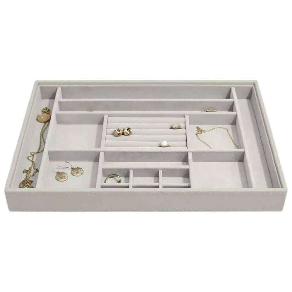 Ta damska, bardzo duża warstwa akcesoriów do pierścionków marki Stackers jest wykonana ze sztucznej skóry i aksamitu i jest dostępna w kolorze beżowym. Wymiary: 4 cm (wysokość) x 36 cm (szerokość) x 23,9 cm (głębokość). Aby zachować pudełko na biżuterię w dobrym stanie, zaleca się wycieranie go do czysta. Wszystkie pudełka na biżuterię są dostarczane w komplecie z opakowaniami typu stacker. Warstwa akcesoriów do pierścionków Supersize Stackers - Taupe Beige umożliwia układanie jej z innymi warstwami supersize z kolekcji Stackers w celu stworzenia własnego, niestandardowego pudełka na biżuterię odpowiedniego do Twoich potrzeb. Alternatywnie można go używać samodzielnie do uporządkowania pierścionków, bransoletek i innych drobnych akcesoriów. Ta urocza warstwa, starannie wykonana z wysokiej jakości materiałów, będzie idealna dla tych, którzy lubią dodatki.