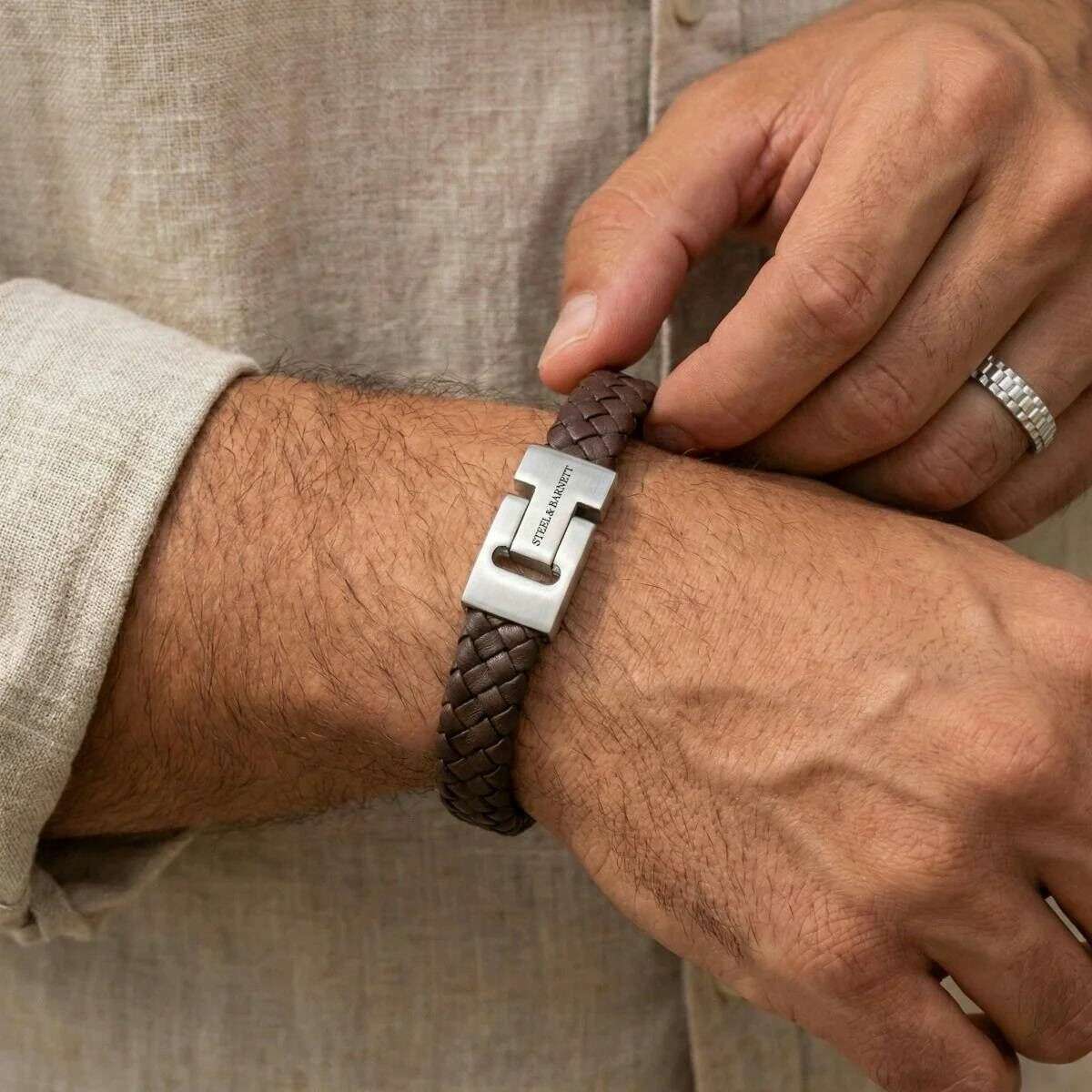 Wykonana w 100% ze skóry nappa i stali nierdzewnej, brązowa męska pleciona skórzana bransoletka Harrison autorstwa projektanta Steel & Barnett. Wszystkie bransoletki są dostarczane w komplecie ze stalowym opakowaniem Barnett. Bransoletka z grubej plecionej skóry Steel & Barnett Harrison w kolorze brązowym stanowi wyrafinowane połączenie najwyższej jakości wykonania i wyrafinowanego designu. Wykonany ręcznie w 100% z prawdziwej skóry Nappa, jego gruba, misternie pleciona struktura zapewnia zarówno trwałość, jak i ponadczasowy wygląd. Przy szerokości 12 mm oferuje imponujący, a jednocześnie wszechstronny wygląd, który uzupełnia różnorodny wygląd. Bransoletka jest wykończona zapięciem ze szczotkowanej stali, wykonanym ze stali nierdzewnej 316L, zapewniającej doskonałą wytrzymałość i odporność na korozję. Magnetyczne zapięcie zapewnia bezpieczne i łatwe zamknięcie, dzięki czemu jest zarówno praktyczny, jak i stylowy. Idealnie dopasowany dla współczesnego profesjonalisty, Harrison płynnie łączy strój biznesowy z codziennym, dodając wyrazistego akcentu każdemu zespołowi.