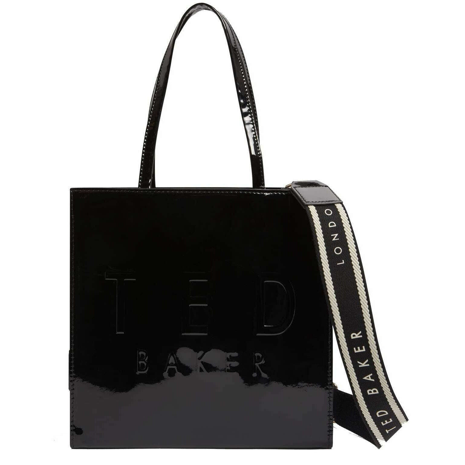 Ta dobrze wykonana damska torba Icona z paskiem, mała ikona firmy Ted Baker jest dostępna w kolorze czarnym i jest wykonana w 100% z poliuretanu. Wymiary: 25 cm (wysokość) x 25 cm (szerokość) x 6 cm (głębokość). Wszystkie torby są dostarczane w komplecie z opakowaniem firmy Ted Baker. Mała torba parciana Ted Baker Iconica w kolorze czarnym ma wykończenie o wysokim połysku i wspaniały, wyróżniający się wielobarwny pasek parciany, dzięki czemu stanowi elegancki, nowoczesny dodatek z idealną równowagą elegancji i współczesnego stylu. Podwójne górne uchwyty zapewniają klasyczne noszenie, a wytłoczone logo można zobaczyć z przodu, a także śmiałe logo na pasku. Noś tę torbę bezproblemowo na co dzień, dopasowując się do swobodnego wyglądu, a także oferując bardziej dopracowany wygląd.