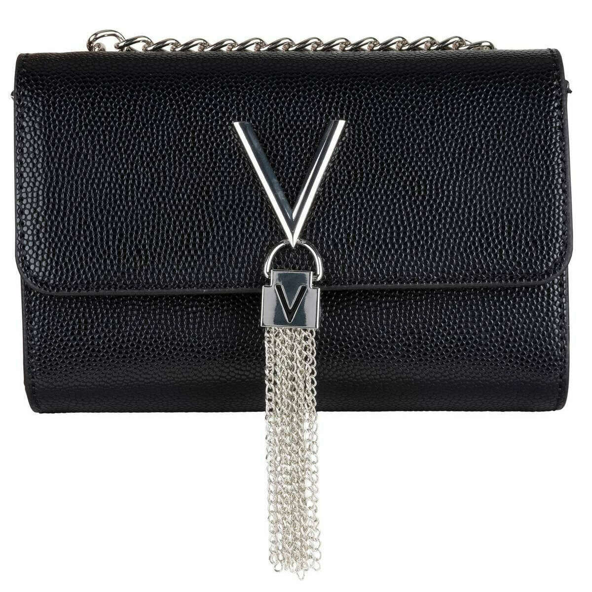 Damska torba na ramię Divina marki Valentino wykonana jest w 100% z poliuretanu i jest dostępna w kolorze czarnym. Wymiary: 17 cm (wysokość) x 23 cm (szerokość) x 8 cm (głębokość). Aby utrzymać torbę w dobrym stanie, zaleca się wycieranie jej czystą szmatką. Wszystkie torby są dostarczane w komplecie z opakowaniem valentino. Torba przez ramię Valentino Divina - czarno-srebrna ma wytłoczony efekt ziaren kawioru, co nadaje jej luksusowy charakter, dzięki któremu będziesz sięgać po tę torbę przy każdej okazji. Zatrzask zapewnia, że ​​wszystkie Twoje rzeczy są bezpiecznie zabezpieczone w środku, a wspaniałe elementy nadają mu ponadczasową elegancję. Idealne połączenie praktyczności i wyrafinowania, ta torebka jest idealnym towarzyszem każdego wyjścia, niezależnie od tego, czy jest to lunch, czy wieczorny koktajl.