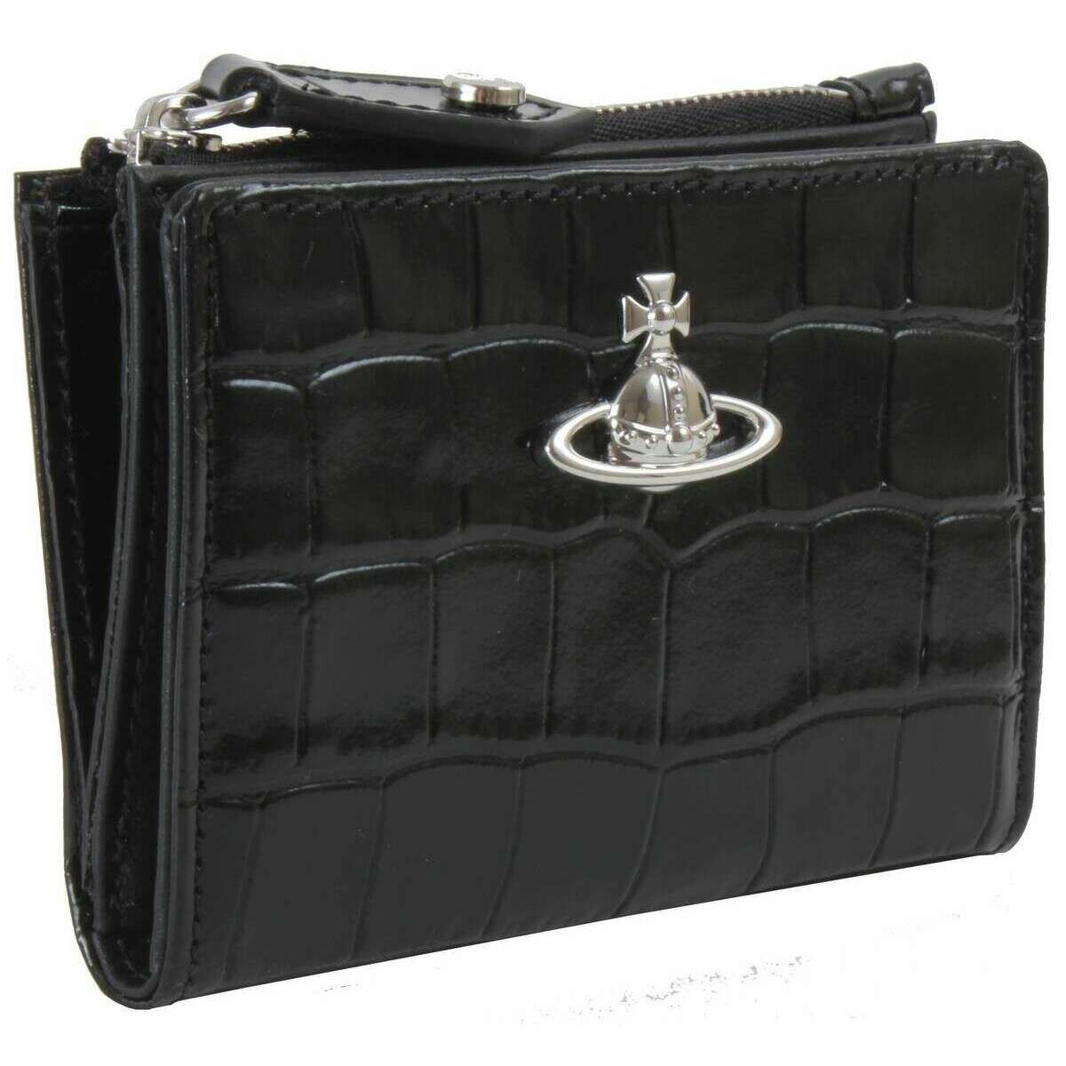 Czarne damskie etui na karty z wytłoczoną krokodylą klapką, dostarczone przez markę Vivienne Westwood, wykonane jest w 100% ze skóry cielęcej. Wymiary: 9 cm (wysokość) x 10,5 cm (szerokość) x 2,5 cm (głębokość). Wszystkie torebki są dostarczane w opakowaniach Vivienne Westwood. Etui na karty Vivienne Westwood Embossed Croc Slim Flap - czarne będzie oszałamiającą torebką na co dzień, jeśli chcesz mieć mniej nieporęczny projekt, który idealnie pasuje do kieszeni i mniejszych torebek, ale nie uchyla się od stylu. Posiada prosty zatrzask do otwierania i zamykania sekcji kart, która oferuje 4 przegródki na karty, a po drugiej stronie znajduje się zapinana na zamek przegródka na monety. Kultowa kula dumnie umieszczona z przodu stanowi idealnego towarzysza.